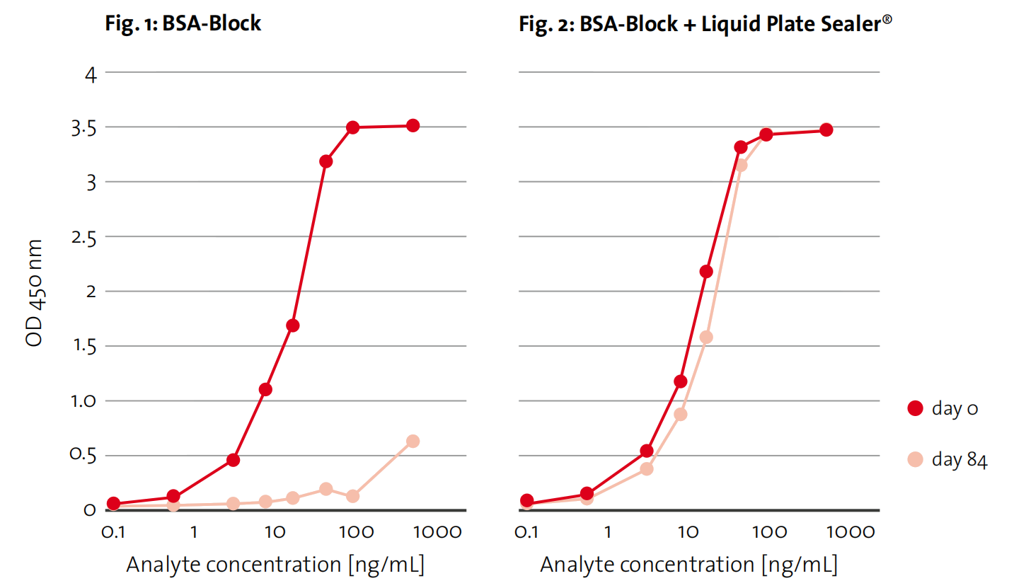 After immobilization of the antibodies/antigens and blocking, Liquid Plate Sealer® seals the plates with a uniform stabilizing layer demonstrating good solubility and without affecting the assay afterwards. It can also be used for stabilizing antibodies and antigens after coating on polystyrene- or glass surfaces for protein arrays. Plates treated with Liquid Plate Sealer® can be stored for long periods after drying.