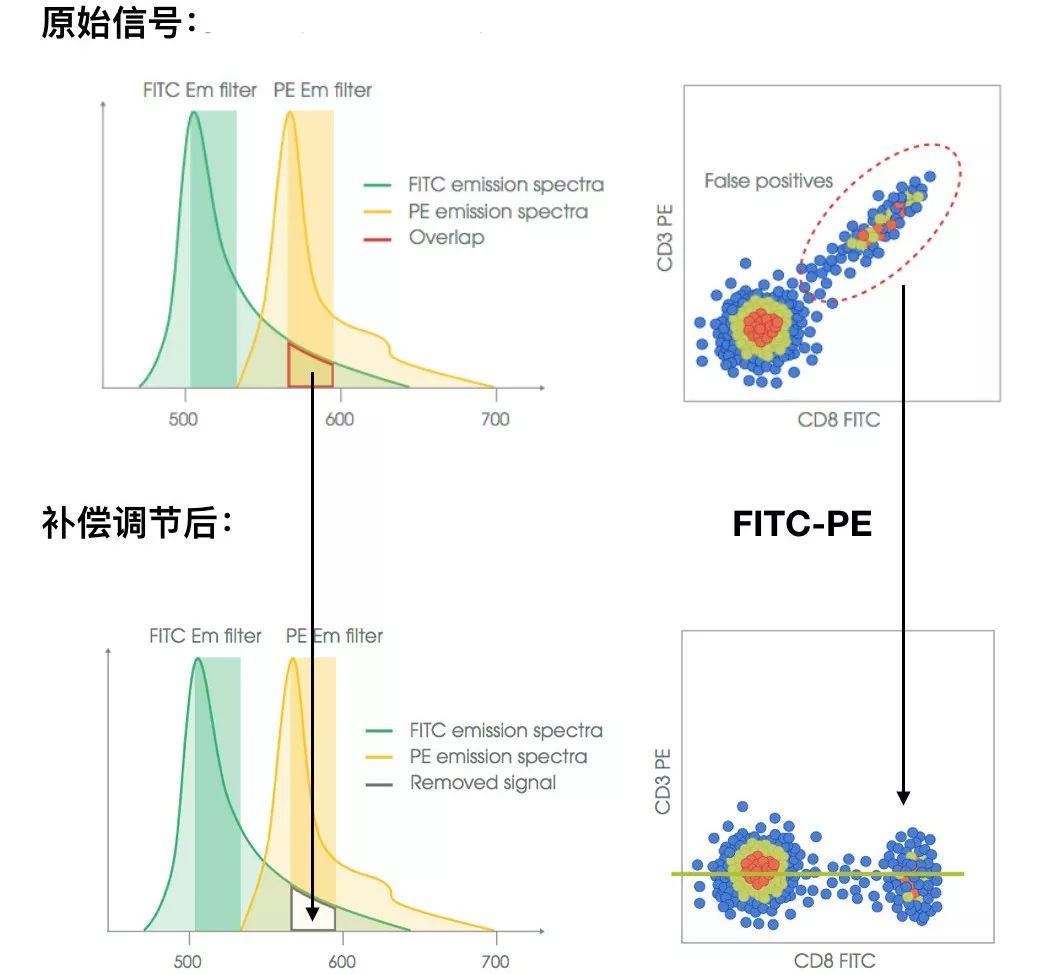 多色實(shí)驗(yàn)時,要檢測某個熒光通道的表達(dá)情況,由于熒光滲漏影響占主要,所以檢測時先將該通道的抗體去掉,檢測一下其它通道漏到此通道的背景熒光水平,進(jìn)行正確排除,從而幫助設(shè)門。