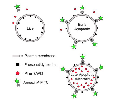 目前至少有十數(shù)種檢測細胞凋亡的方法,從大框架上講,可以劃分為基于細胞形態(tài)、生物學功能和生化標記三大類。這里簡要介紹一下最受歡迎的“Annexin V/PI雙染法”進行流式細胞術質膜分析。