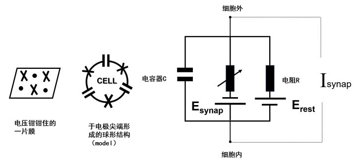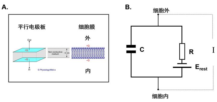 細胞膜由絕緣的磷脂雙分子層構(gòu)成,膜上有很多離子通道和受體,離子通道允許帶電荷離子進出。電學上講,一種離子通道相當于一個微小的電壓源。在這些通道關(guān)閉的情況下, 細胞膜本身相當于電介質(zhì),而靠近細胞膜的細胞內(nèi)液層和外液層相當于電容器的兩個極板,可以儲存電荷。由于不知道細胞膜上都有些什么,我們暫且把膜上所有負責物質(zhì)交換的場所都當成電阻。而Erest代表電阻的在靜息時的電動勢。這也是最簡單的阻-容電路(Resistance-Capacities circuit; RC電路)成分。