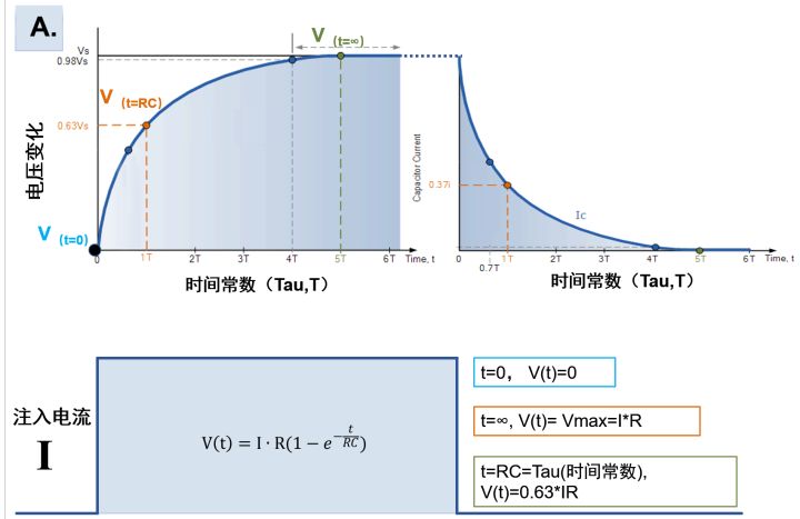 根據(jù)RC電路的電壓反應(yīng)式,以及歐姆定律和基爾霍夫電流定律,我們知道沒有電流注入時(t=0),電路中不會用電流變化;當超長時間注入電流時,電容器短暫的充放電就可以忽略不計,所以電壓反應(yīng)可以近似地看作只有膜電阻做出了貢獻;而當注入一個時間常數(shù)(電阻×電容)的電流時,根據(jù)反應(yīng)式可以知道V(t)=0.63I*R。