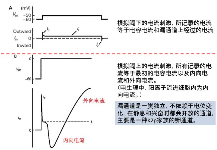 事實上,我們的大腦并沒有一根電極注入電流;但一個神經(jīng)元往往接受成千上萬個突觸的輸入,而突觸的輸入(電-化學-電的信號傳遞)就相當于向神經(jīng)元注入了電流。這時電流會有三個走向:①電容器②離子通道③漏通道。