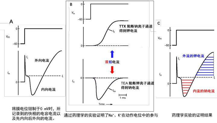 根據(jù)先前證實的”鈉假說“以及Goldman-Hodgkin-Katz電流方程和電壓方程推測出的鉀離子在靜息電位是通透性的貢獻,HH兩人使用阻斷劑TTX(從河豚體內(nèi)提取的河豚毒素)阻斷鈉離子通道,發(fā)現(xiàn)只剩下了外向電流,而通過阻斷劑TEA阻斷鉀離子通道,發(fā)現(xiàn)只剩下內(nèi)向電流,從而證明了動作電位的發(fā)生過程中,鈉離子首先大量內(nèi)流使得膜電位去極化,然后鉀離子大量外流使得膜電位超極化,直到恢復靜息電位。