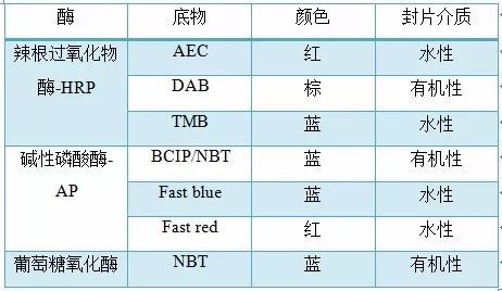 該表格列舉了常用的酶和搭配的底物及封片介質(zhì),根據(jù)實驗需要進行選擇。