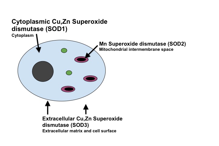 在氫離子與超氧化物發(fā)生反應(yīng)生成過氧化氫和氧的過程中,SOD充當(dāng)催化酶作用。人類線粒體中存在著含錳(Mn)的SOD(MnSOD),細(xì)胞漿則為含銅(Cu)、含鋅(Zn)的SOD。目前還認(rèn)為,SOD尚有存在于細(xì)胞外的其它三種類型。