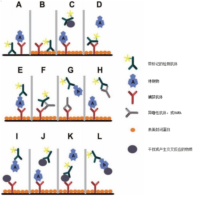 所有的免疫分析方法的特征是在目標(biāo)分析物和抗體之間的結(jié)合反應(yīng)。這些方法存在的問題是經(jīng)常發(fā)生的干擾,導(dǎo)致了錯(cuò)誤的檢測(cè),這個(gè)問題至今未得到充分地解決。典型的干擾有非特異性結(jié)合,導(dǎo)致較差的信噪比和高背景, 交叉反應(yīng)和基質(zhì)效應(yīng)。簡(jiǎn)單地說,這些效應(yīng)大多是基于分析物、捕獲抗體或檢測(cè)抗體與外部物質(zhì)或表面的直接相互作用。圖1表示了一種典型干擾效應(yīng)的簡(jiǎn)化方案。在技術(shù)文獻(xiàn)中經(jīng)常被描述的已知的干擾因素有如異嗜性抗體和HAMAs(人抗小鼠抗體)、類風(fēng)濕性因子、白蛋白、補(bǔ)體,溶菌酶以及其他等。