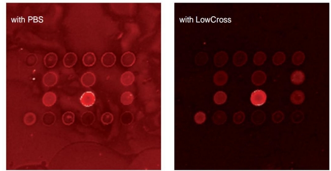 圖2到圖5顯示使用LowCross Buffer®可防止免疫分析中典型的干擾效應(yīng)的不同示例。圖2顯示了在蛋白芯片應(yīng)用中使用LowCross Buffer®可降低高背景,并將信噪比從3.4提高到17.3。在這個(gè)實(shí)驗(yàn)中,對(duì)不同多克隆抗EPIL抗體(EPIL=早期胎盤胰島素樣生長(zhǎng)因子) 的適用性進(jìn)行了測(cè)試??贵w使用濃度為500µg/ml、體積為1.8 nl/spot通過生物芯片打點(diǎn)機(jī)(GMS 417)固定在氨基硅烷化的微陣列載玻片上。隨后,將2ml的EPIL過度表達(dá)細(xì)胞系(SKBR3) 培養(yǎng)基與染料Oyster650P混合,此時(shí)培養(yǎng)基內(nèi)蛋白質(zhì)被標(biāo)記。分別使用LowCross Buffer®和PBS按照1:20稀釋培養(yǎng)基,加在載玻片上進(jìn)行孵育。沖洗載玻片后,用熒光掃描儀(GMS 418) 進(jìn)行讀取,并用ImaGene分析數(shù)據(jù)。通過使用LowCross Buffer®可以明顯降低背景信號(hào),從而使得更好地區(qū)分單個(gè)抗體是否適用于檢測(cè)EPIL。