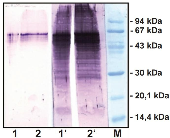 圖3: Western blotting法檢測(cè)細(xì)胞角蛋白4、5和6。圖中顯示了實(shí)驗(yàn)中使用LowCross Buffer®和TTBS檢測(cè)的效果對(duì)比。LowCross Buffer® 可以完全防止不必要的結(jié)合。細(xì)胞角蛋白4、5和6在56-60kDa之間,使用LowCross Buffer® 可清晰地被檢測(cè)到。泳道1和1'樣本來自肝細(xì)胞,泳道2和2'樣本來自Hela細(xì)胞。M為分子量marker,用酰胺黑染色。印跡膜是硝酸纖維素膜porablot NCP。