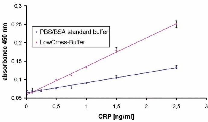 圖4:ELISA法檢測(cè)家兔血清中的CRP。 LowCross-Buffer®通過去除基質(zhì)效應(yīng)來提高靈敏度。