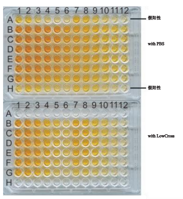圖5: 在用豚鼠IgG進(jìn)行ELISA實(shí)驗(yàn)中,通過使用LowCross-Buffer®防止假陽性結(jié)合(A1- 12行為對(duì)照組,H1-12為空白組)。